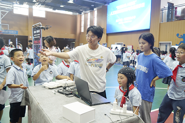 “脑控无人机”体验区排起长队,在操作人员帮助下,参与体验的同学注视电脑屏幕的一个无人机运动指令,无人机立刻收到指令并自动飞起,实现“意念飞行”;“熊猫小车冒险记”体验区,同学们通过操控可爱的熊猫造型无人小车,探索编程的世界;“AI绘画”体验区充满了欢声笑语,同学们将自己的绘画创意输入AI对话框,屏幕上便快速生成专属画作,由此制成一枚独一无二的原创徽章;“机器狗”体验区,同学们与由算法与网络通信控制的机器狗进行近距离互动,行走、跳跃、奔跑等模拟犬类的动作吸引了众多同学围观;“软件编程”体验区内,同学们在老师的指导下,体验趣味小游戏与实用小程序,进一步感知编程的魅力。