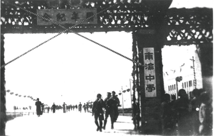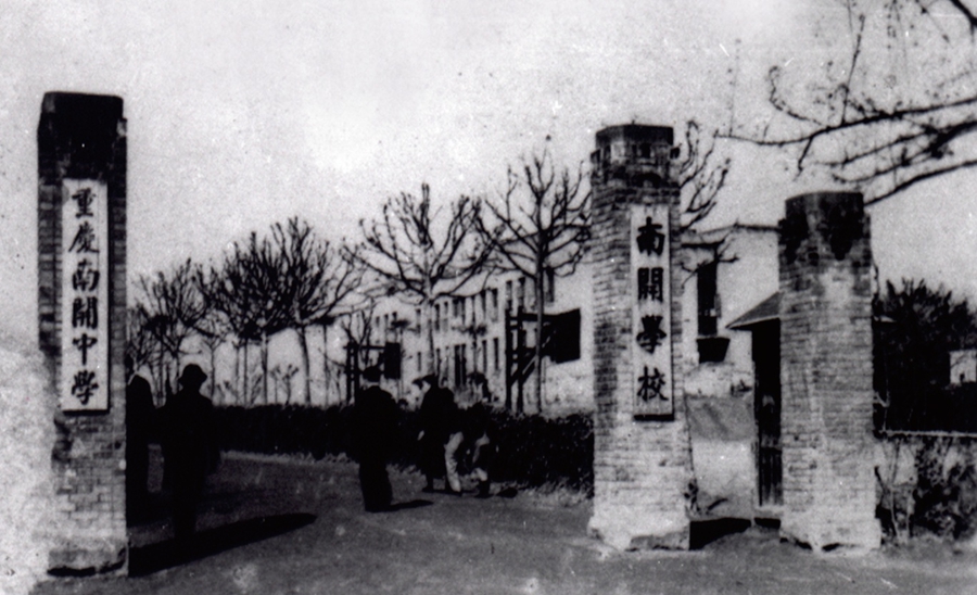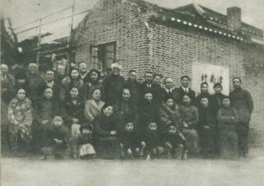 1939年3月周恩来/后右一、邓颖超/前排中、张伯苓/后排中白发老者,在重庆南开中学津南村