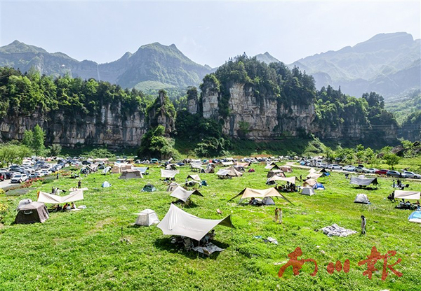 游客在金佛山万卷书台景区露营游玩,体验山水秘境的自然野趣。资料图片