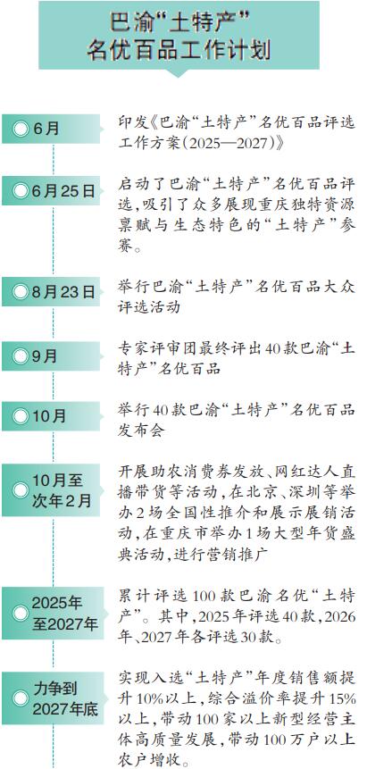 “紧紧围绕充分挖掘‘土’的资源,放大‘特’的优势重要指示要求,落实市委、市政府有关工作部署,我们制定了《巴渝‘土特产’名优百品评选工作方案(2025—2027年)》。”市农业农村委相关负责人说。