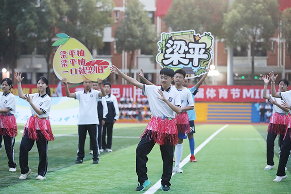 此外,揭幕战上还进行“我为家乡代言”环节。代表涪陵区的班级用创意舞蹈再现榨菜制作工艺;代表梁平区的学生以灵动舞姿展现梁平柚的丰收景象;潼南区的代表队用“酸甜”主题演绎柠檬特色;石柱县的同学们则带来了原生态的土家歌舞……这些充满创意的展示,让足球赛场同时成为重庆地域文化交流的舞台。
