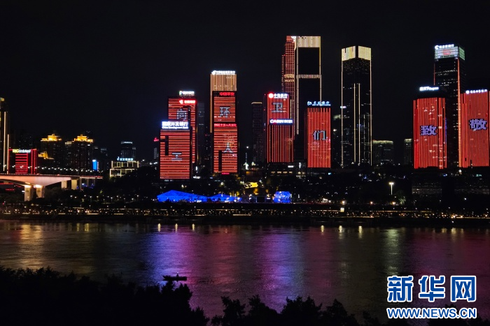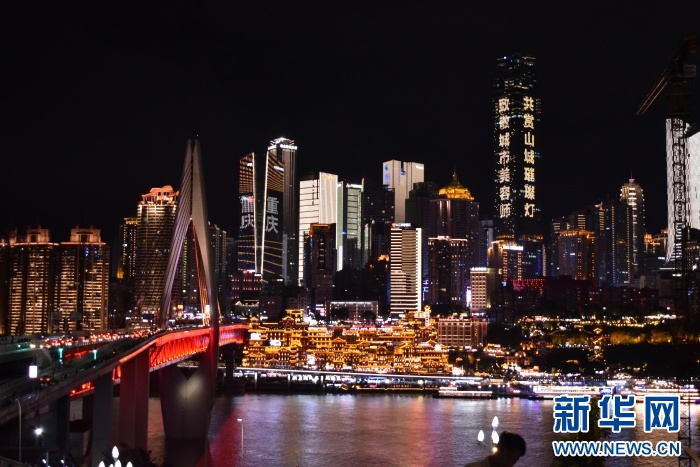 “致敬城市美容师 共赏山城璀璨灯”问候标语闪耀重庆两江四岸。新华网发