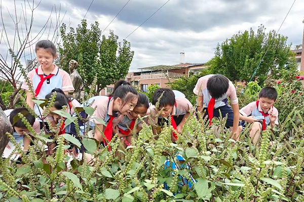 重庆市渝北区笃信实验学校“小郎中”社团学生在中药种植基地辨识中草药。