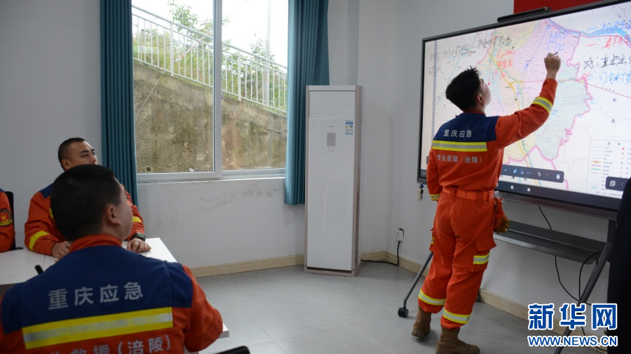 重庆市专业应急救援涪陵支队荔枝大队在制定日常巡查路线。新华网发(刘良娟 摄)