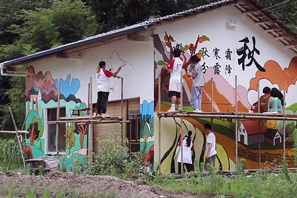重庆工程职业技术学院艺术类专业师生在城口县咸宜镇绘制乡村文化墙。