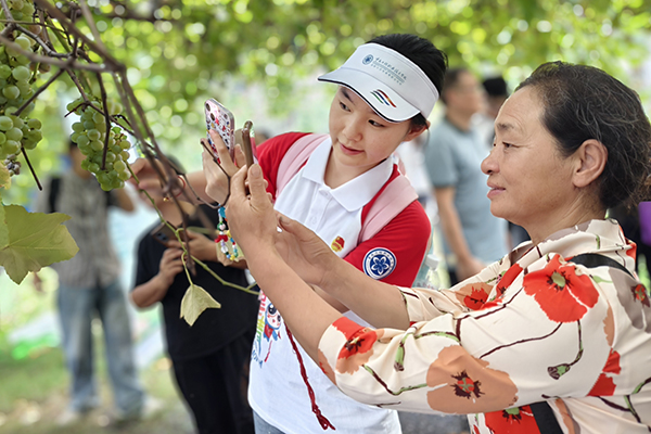 重庆工程职业技术学院市场营销专业学生在暑期“三下乡”社会实践活动中,在田间地头指导村民利用手机拍摄短视频,“实景式”讲解农产品网络营销技巧。