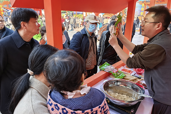 参展企业向市民推介梁平豆筋。(葛琦 摄)