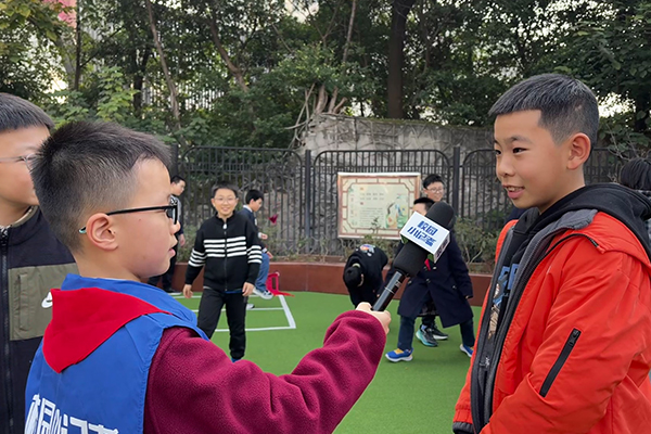 校园小记者胡俊彦深入活动现场积极了解同学们参与运动会的感受。