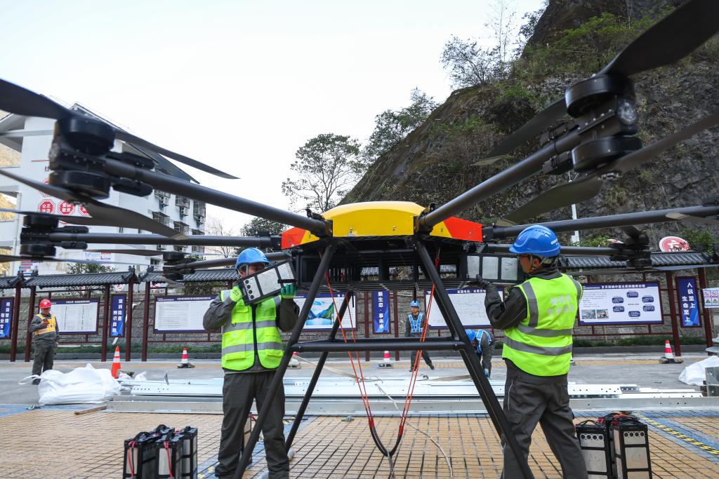 11月27日,在重庆市巫溪县中梁乡35千伏西土线改造现场,现场工作人员操作重载无人机吊运新建铁塔塔材。新华社记者 黄伟 摄
