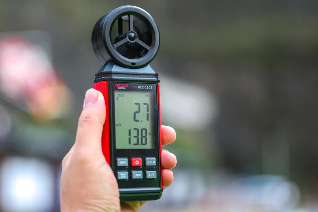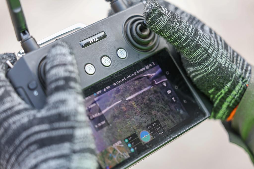 11月27日,在重庆市巫溪县中梁乡35千伏西土线改造现场,现场工作人员利用风速测量仪监测无人机起降的作业条件。新华社记者 黄伟 摄