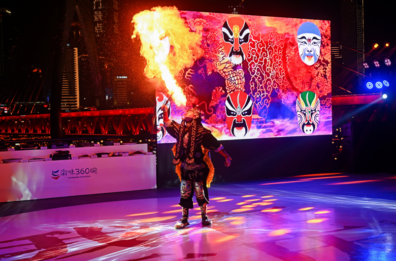 “夜演”方面,近年来,重庆也推出多个创新项目。无人机表演虚实交融,川剧京剧韵味悠长,舞台剧、音乐会与山水实景演出各具风情,铜梁龙舞尽显恢弘,文艺气息在夜色中流淌。现场展示的大型红色历史舞台剧《重庆1949》精彩片断、川剧变脸喷火表演等,让观众连声赞叹。