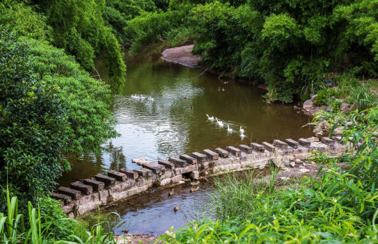 在珠滩村的小河里,鸭群正在嬉戏。(胡光银 摄)