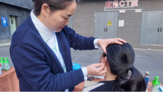 中医药文化集市上,医护人员为市民提供耳穴压豆体验服务。
