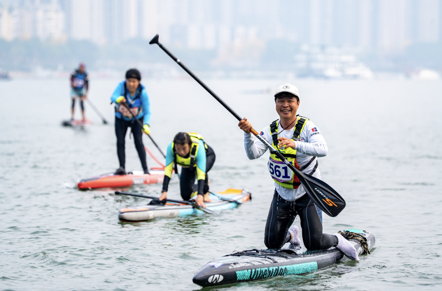 来自湖南的选手杨彪赛前细致调整脚绳:“提前两天就来适应水域了,这段江流有特点,但航道标识清晰,划起来心里有底。”比赛中段,江风微起,对选手的平衡与耐力提出考验,不少选手灵活变换姿态,稳住节奏。最终,叶贵桐与徐浩婷组合率先冲线,夺得佳绩。