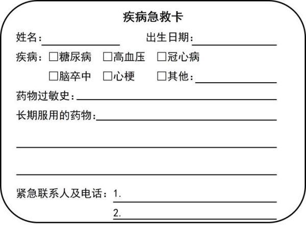 药师特别提醒:建议填写一份疾病急救卡,随身置于显眼处,或设为手机及电子手表的锁屏壁纸。(曹璨)
