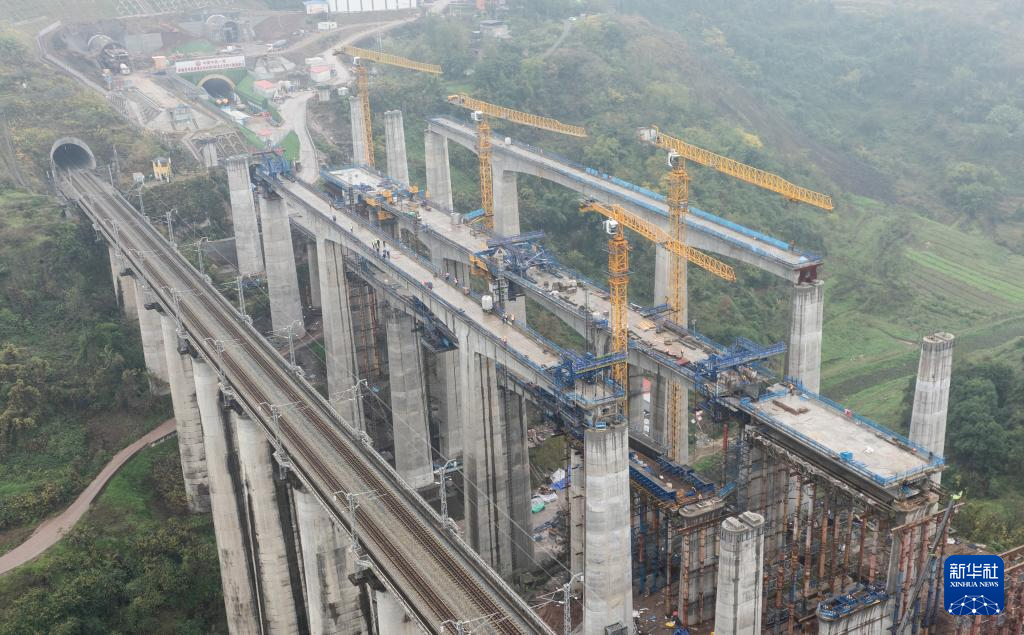 这是12月25日拍摄的渝万高铁打青沟左线大桥连续梁(右二)建设现场(无人机照片)。新华社记者 陈诚 摄