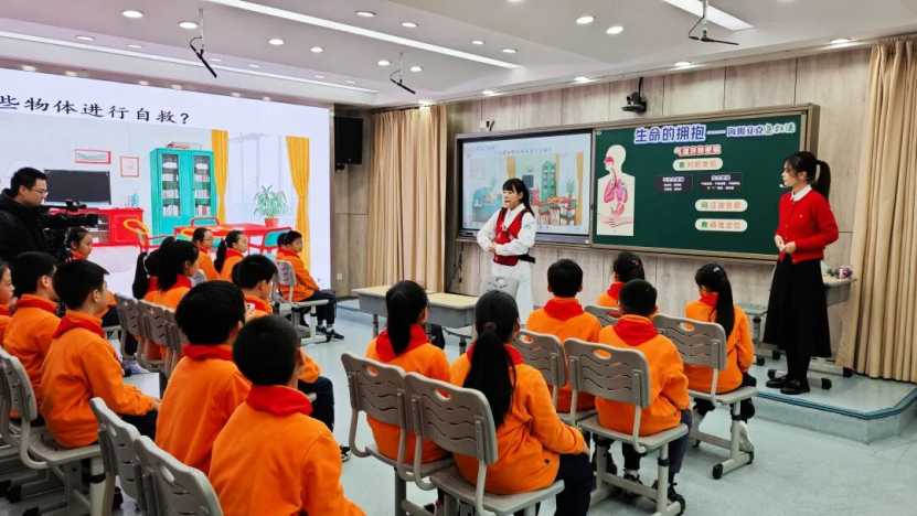 启动仪式上,与会领导共同为项目启幕。随后,天星桥社区卫生服务中心中心红十字应急救护师资志愿者为六年级学生带来健康技能演示课《急救小英雄:生命的拥抱——海姆立克法》。志愿者利用专业训练模型,讲解并演示海姆立克急救法的操作步骤,帮助学生掌握基本的应急自救互救技能。