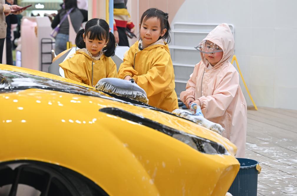 1月2日,在重庆两江新区一商场内,小朋友体验洗车乐趣。