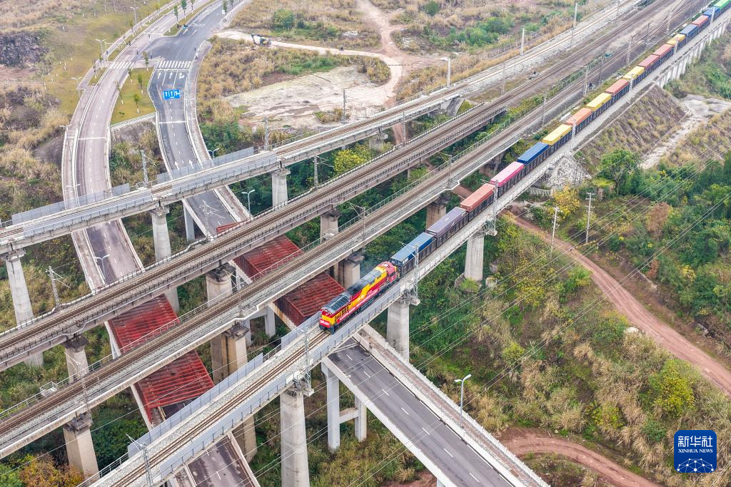 1月7日,铁海联运“重庆造”新能源汽车专列在重庆果园港鱼嘴站顺利发车(无人机照片)。新华社记者 唐奕 摄