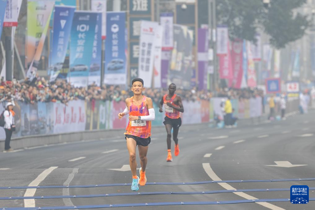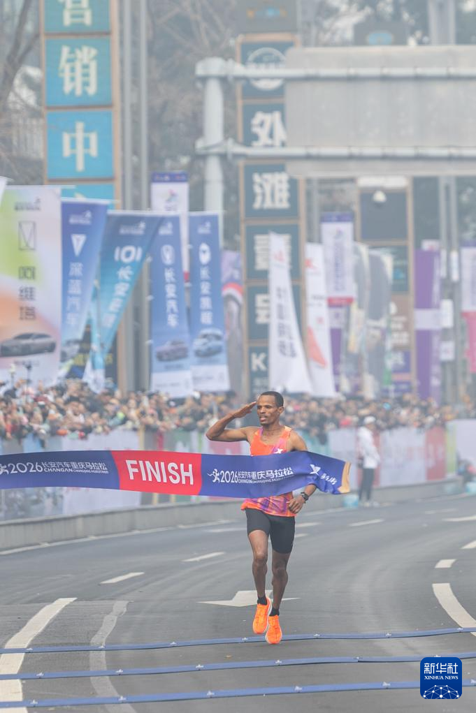 1月18日,埃塞俄比亚选手阿迪苏·特斯法洪·塔费雷在比赛中冲线。最终,他获得男子组冠军。新华社记者 黄伟 摄