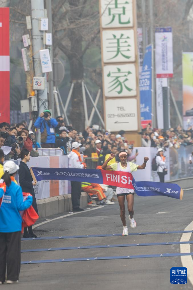 1月18日,埃塞俄比亚选手科贝布什·伊斯玛在比赛中冲线。最终,她获得女子组冠军。新华社记者 黄伟 摄