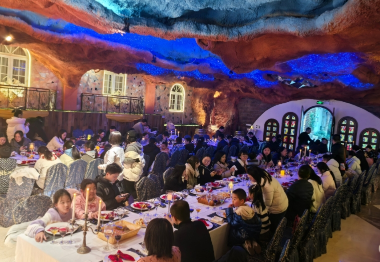 走进景区餐厅,烛光摇曳的长桌依次排开,身着特色服饰的工作人员穿梭其间,将特色菜品次第呈上,让游客们在推杯换盏间感受“以酒为媒、以食会友”团圆氛围。“长桌宴既有仪式感又热闹,全家人团圆在一起格外尽兴!”来自四川省华蓥山市的游客冉女士,对红酒长桌宴赞不绝口。