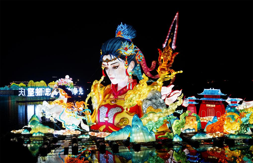 图为表现石柱县秦良玉将军形象的水上灯组。彭博摄