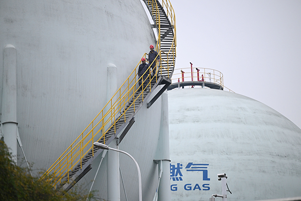 工作人员对天然气球罐进行巡查。
