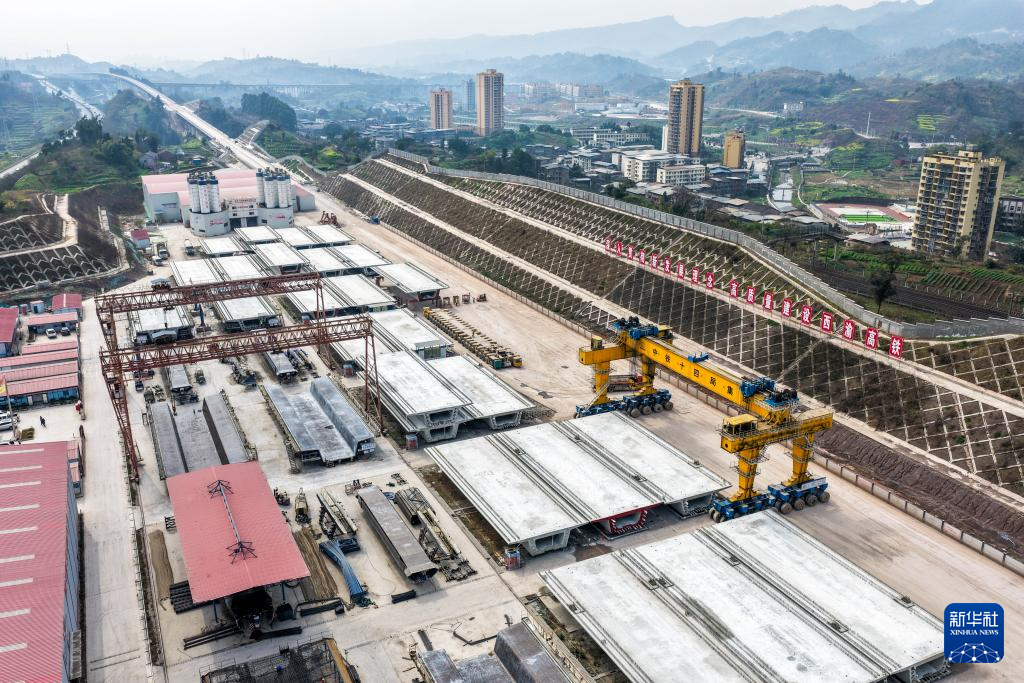 2月26日,在西渝高铁合川东制梁场,大型机械在进行提梁、运梁作业(无人机照片)。新华社记者 唐奕 摄