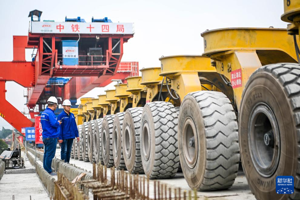 2月26日,在重庆市合川区清平镇的西渝高铁建设工地,工人在进行架梁作业。新华社记者 唐奕 摄