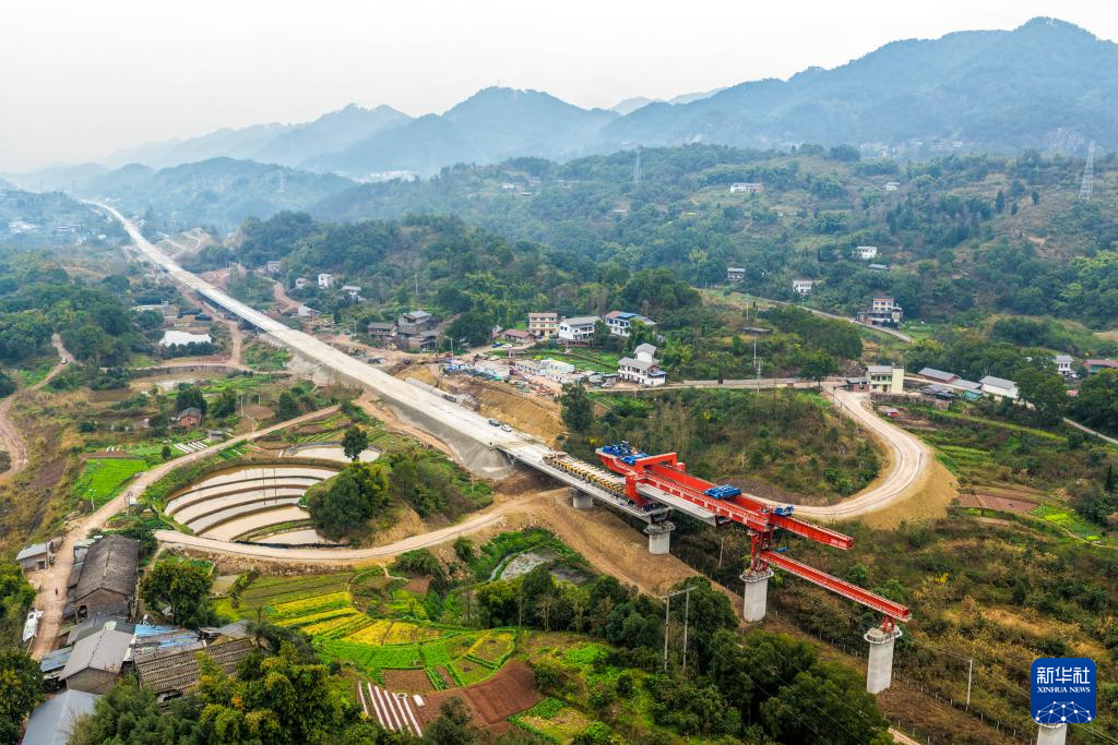 2月26日,在重庆市合川区清平镇的西渝高铁建设工地,架梁机在进行架梁作业(无人机照片)。新华社记者 唐奕 摄