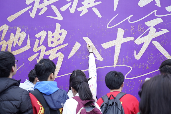 到达公园后,学生们踏上红毯在“骐骥墙”上签名。