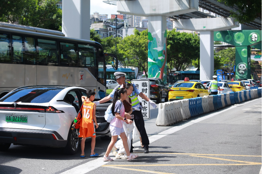 龙腾大道沿线分布着重庆育才中学谢家湾、大公馆两个校区,近万名学生中四分之三为走读生,早晚接送高峰叠加日均20万辆的车流量,学校周边道路长期拥堵。2026年春季开学后,交管部门通过车道“瘦身”,在周边道路新增一条车道,并联合城管部门规划临时停车区域。一方面改造道路交通设施、优化交通组织、拓展通行空间,另一方面建立“警校家城”联动机制,引导车辆错峰出行、源头分流,有效缓解校园周边拥堵难题。
