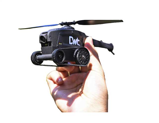 记者看到,“双擎”不仅有可“上天”的螺旋桨,还有能“入地”的轮子,机身长17.5厘米、宽5.1厘米、高6.8厘米,仅成人手掌般大小,是同类无人机中体积最小的。
