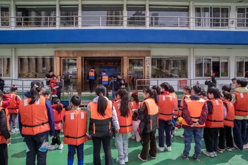 下午2时30分,“小记者”们在青年民警辅警的引导下有序登船、穿戴救生装备,开启水上警务体验之旅。在趸船甲板,青年民警邓建斌结合飞行救生圈、无人救生艇等智能化救生设备,细致讲解各类装备的功能与实战应用场景,生动的讲解吸引孩子们围拢聆听,不时发出阵阵惊叹,直观感受水上救援装备的科技力量。