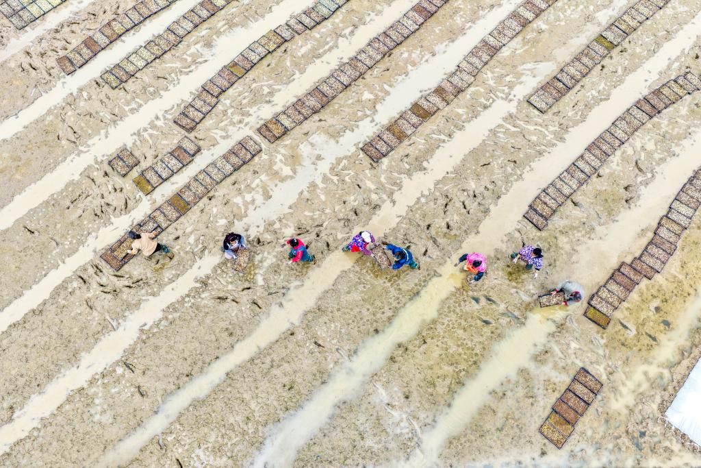 3月24日,农民在田间摆放水稻育秧盘(无人机照片)。新华社记者 唐奕 摄