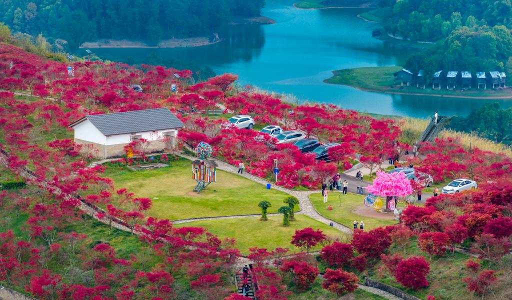 满目如霞的红枫与青山绿水相映成趣,让人仿若置身春日画卷。刘纪湄摄