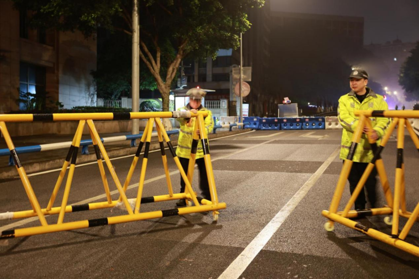 凌晨时分,参勤警力提前到岗布设隔离设施。李林健 摄