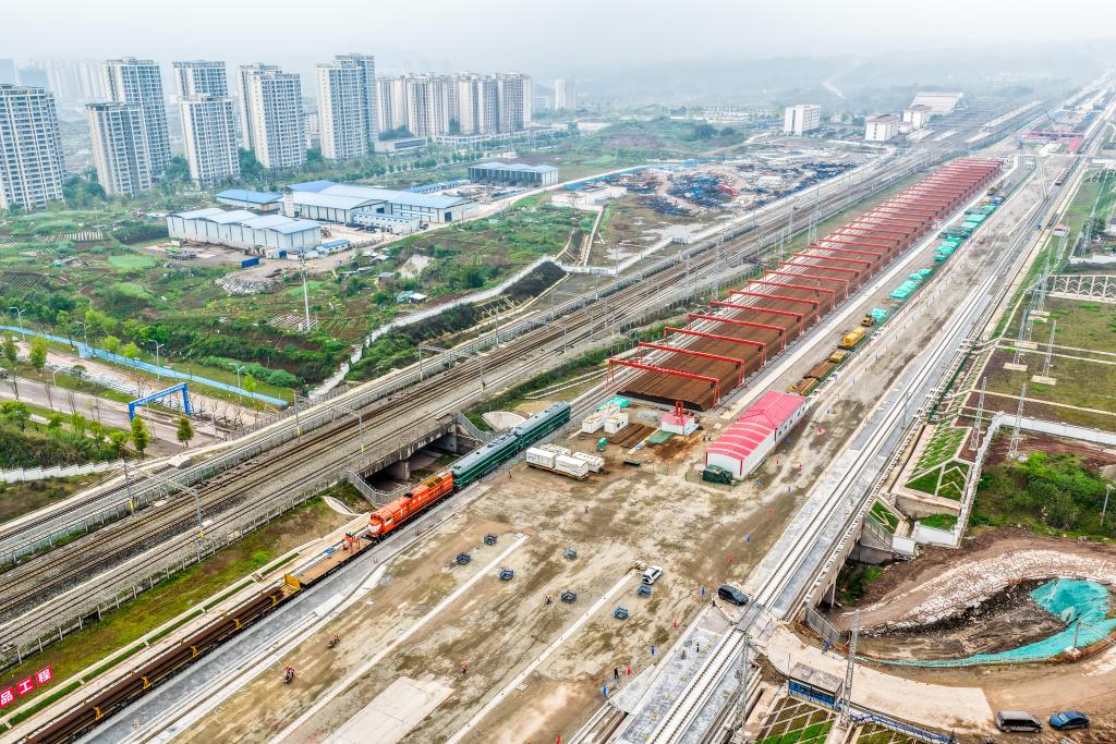 这是4月3日拍摄的渝万高铁铺轨工程建设现场(无人机照片)。