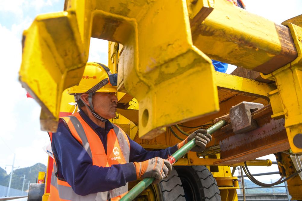 4月3日,工人操作铺轨机在渝万高铁铺轨工程建设现场施工作业。新华社记者 唐奕 摄
