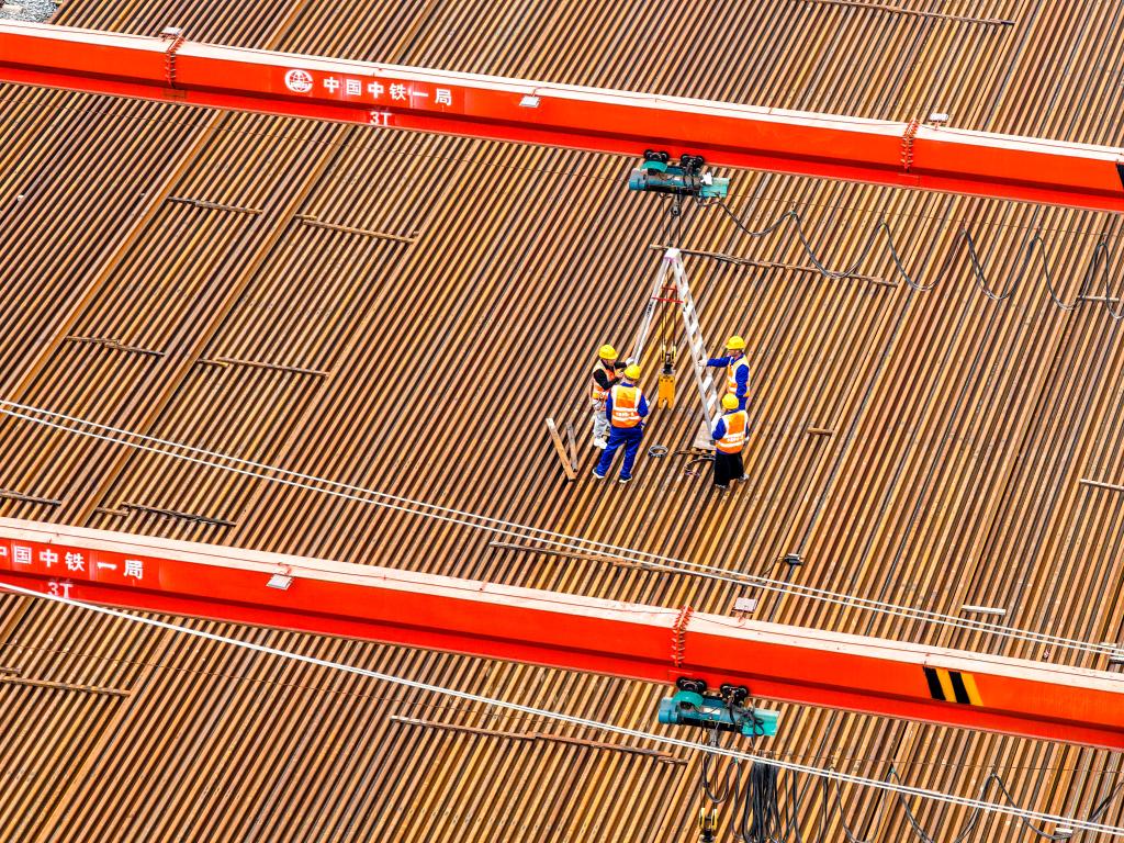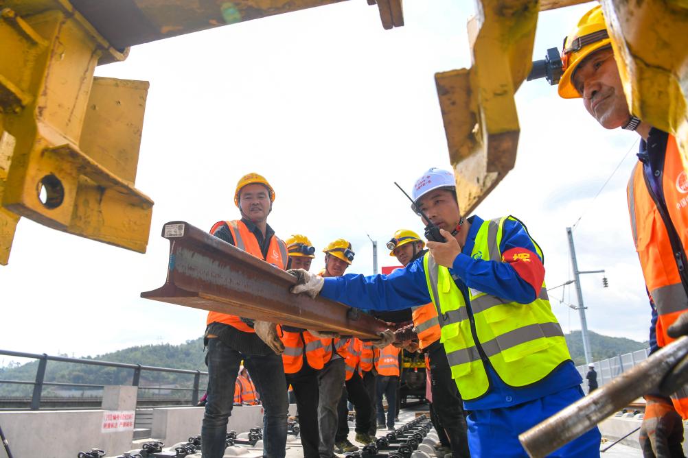 4月3日,工人在渝万高铁铺轨工程建设现场施工作业。新华社记者 唐奕 摄