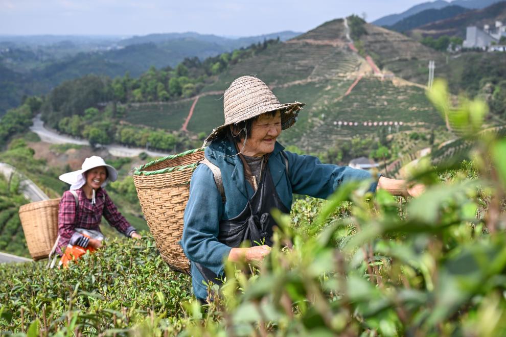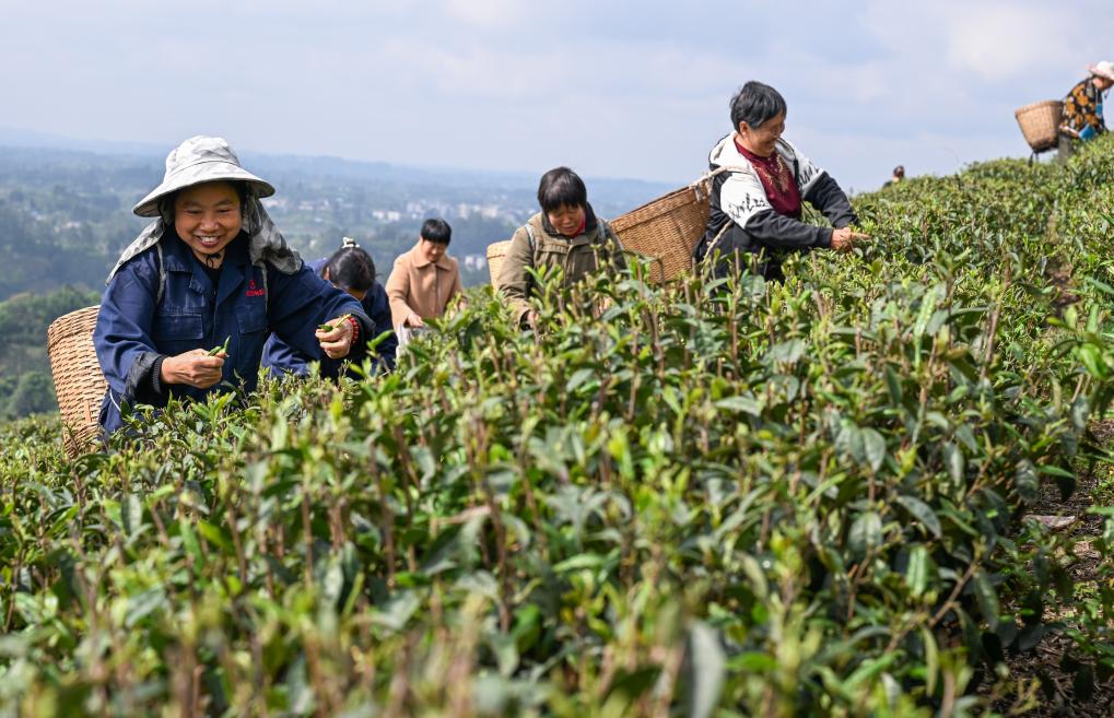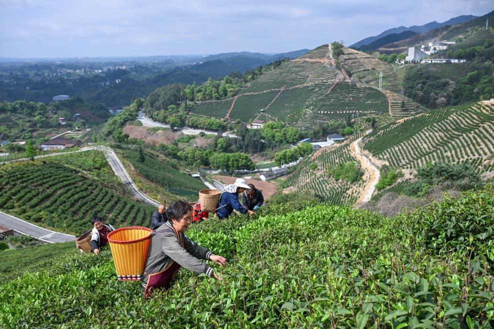 4月3日,重庆市永川区宝峰镇茶农在茶园里采摘茶叶。新华社记者 陈诚 摄