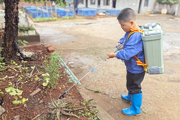 潼南小学学生在春假里进行农事体验,学会使用喷雾器。