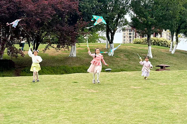 公园里微风轻拂,孩子们拉着风筝线奔跑跳跃。