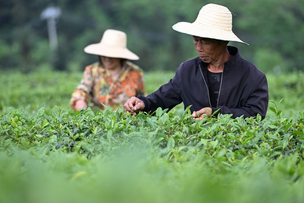 4月11日,茶农在重庆市永川区廖云祥茶树种植基地采茶。新华社记者 王全超 摄