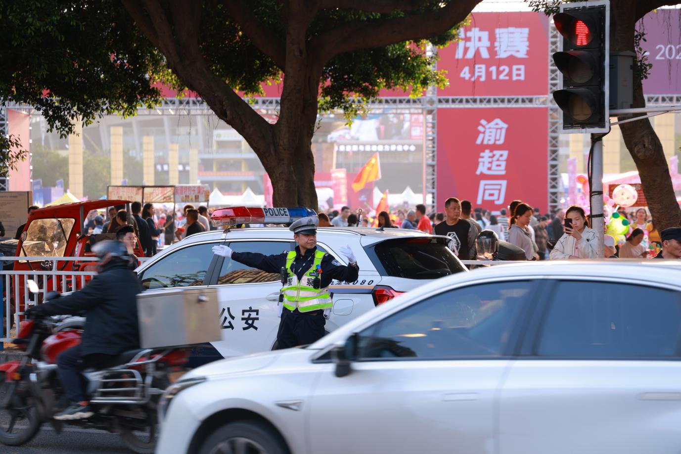 赛场内,执勤警力在看台来回巡查,回应群众咨询、引导座位,用藏蓝身影守护观赛空间;赛场外,五环广场的“渝超集市”烟火升腾,民警与相关部门全程值守,排查安全隐患,确保球迷“看得开心、吃得放心”。从决赛前的交通管制提示,到赛后的有序散场,九龙坡警方以“科技+人力”双轮驱动,将“平安底色”融入赛事每一个环节。