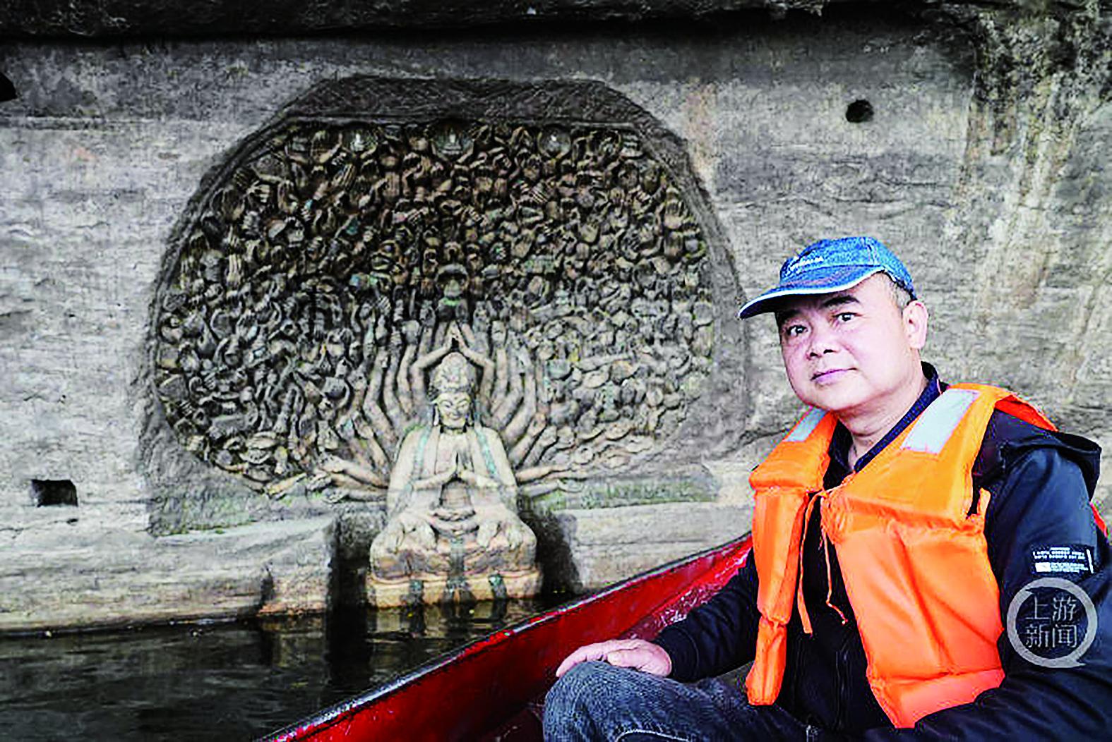 船一点点接近,邵天云立于船头,凝视自己当年的作品。看着水波之间浮现的那一排排手,他凝视了很久。身边不时有人坐船经过,拍下水中千手观音。来自北京的柳先生跟随研究敦煌学的朋友专程来玉滩参观,他对邵天云说,希望以后会有更多人能来感受石刻艺术的魅力。