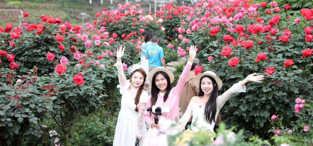 4月15日,“渝见玫瑰·醉美永川”2026重庆市第一届山地玫瑰嘉年华在重庆市永川区三教镇玫瑰庄园启幕,游客走进山地花海,感受春日气息。