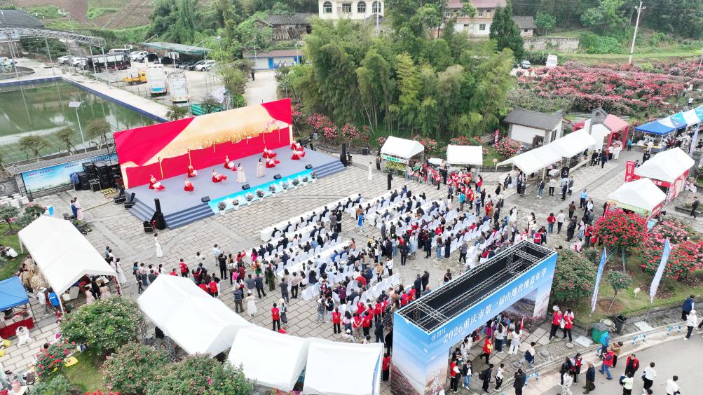 4月15日,演员在渝见玫瑰·醉美永川——2026重庆市第一届山地玫瑰嘉年华开幕式上表演(无人机照片)。