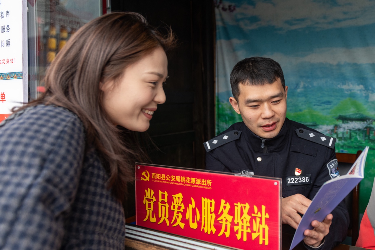 民警在党员爱心服务驿站为游客讲解游客须知。酉阳县公安局 供图